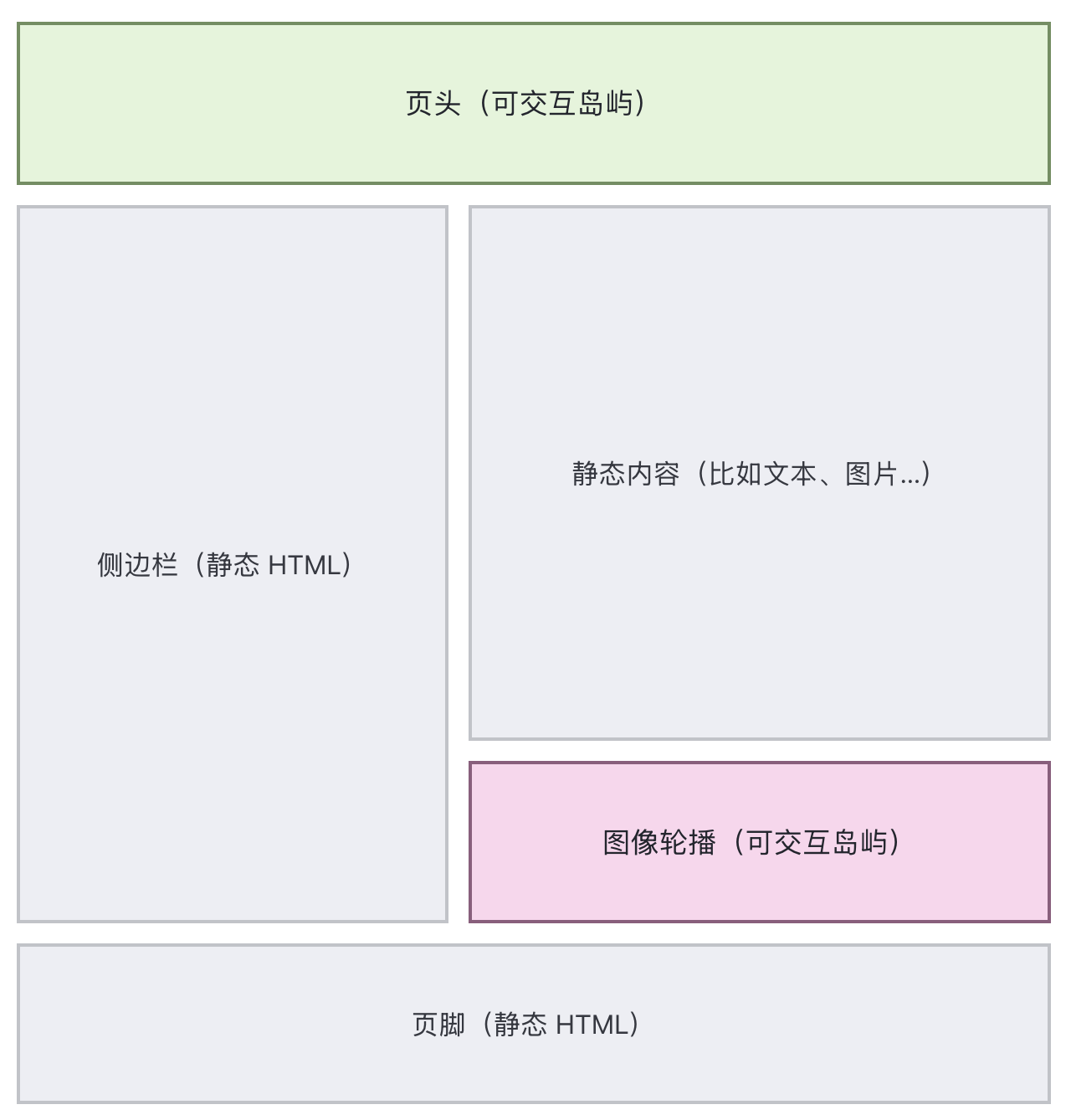 与渐进式水合作用类似,使用岛屿架构渲染页面,不仅能逐步初始化页面中较复杂的动态部分,还能分别初始化。这意味着页面的各个区域无需先加载其他内容即可实现交互。